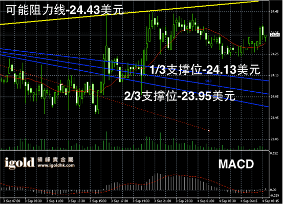 白银阴阳烛录得离散率一直较高,前后阴阳烛间隔出现,分布在红色日平均移动线中位,短线MACD显示呈中性,短线白银价格或继续在24 – 24.5美元区间震荡整理。后期上行阻力有所加大。