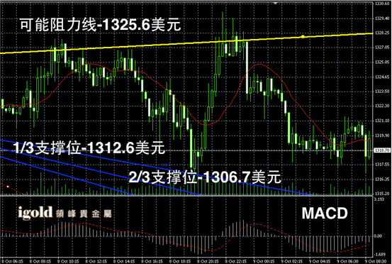黄金阴阳烛录得离散率加大,后期小幅回落,前后阴阳烛录得间隔出现,整体处于红色日平均移动线中位,短线MACD显示呈中性。整体上,黄金价格短线或继续区间内偏空整理。