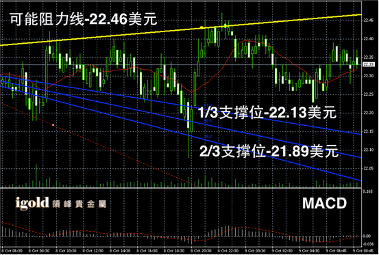 白银阴阳烛录得平均分布在红色日平均移动线中位,短线MACD呈中性,柱体分布离散,后期白银价格或继续在22美元附近窄幅震荡。