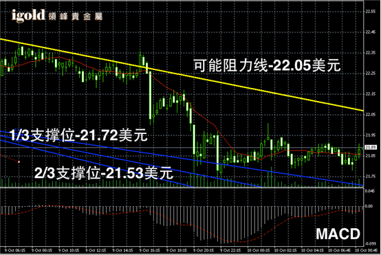 白银长线阴阳烛录得收高于红色日平均移动系统,但是已经开始逼急中位水平,且在Fibonacci第一区间偏空震荡,长线MACD弱势空头主导,RSI小幅下探至48,因为已经突破22美元阻力位,或首先进行低位支撑的探寻。