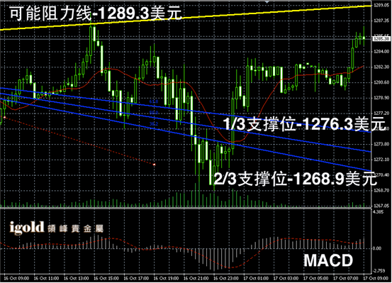 黄金阴阳烛录得柱体小幅高于红色日平均移动线,短线MACD显示多头积聚,后期或继续在高位窄幅震荡,并可能进一步冲击1290美元附近。