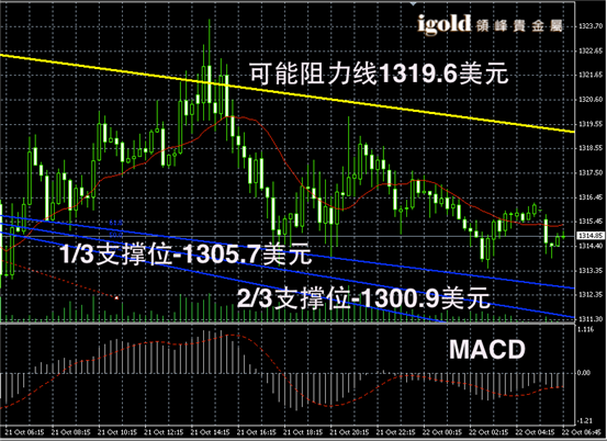 黄金长线阴阳烛录得十字星出现,显示反弹动力的趋势,不过仍然高于红色日平均移动系统,长线MACD显示弱势空头主导,RSI则录得在51附近。黄金价格可能在1310美元上下窄幅震荡。