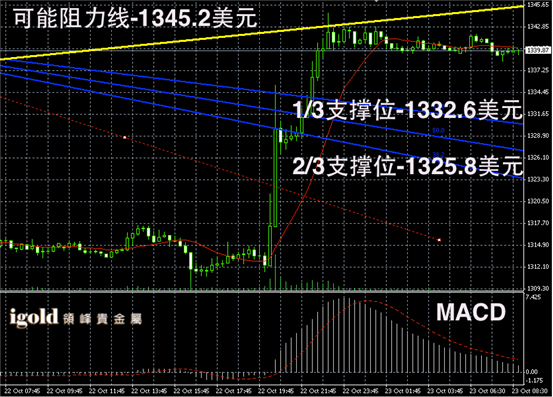 黄金长线阴阳烛录得大幅高于红色日平均移动系统,长线MACD显示空头主导,RSI则录得上行至57附近,后期黄金长线价格如果守住此次反弹趋势,可能会 进一步冲击Fibonacci第一区间阻力线,即1350美元附近。