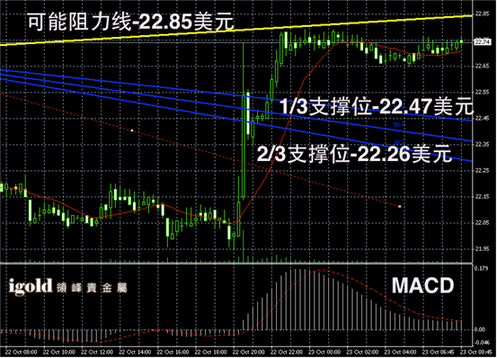 白银阴阳烛录得上扬后,柱体录得收短,后期整体处于红色日平均移动线中位,短线MACD显示弱势多头主导,后期白银或在22.5美元附近进行低位支撑的探寻。