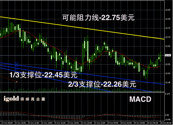 白银阴阳烛录得柱体收短,短线MACD呈中性,前后阴阳烛间隔出现,整体处于红色日平均移动线中位,后期白银价格或浮动在22.5 – 23 美元区间。