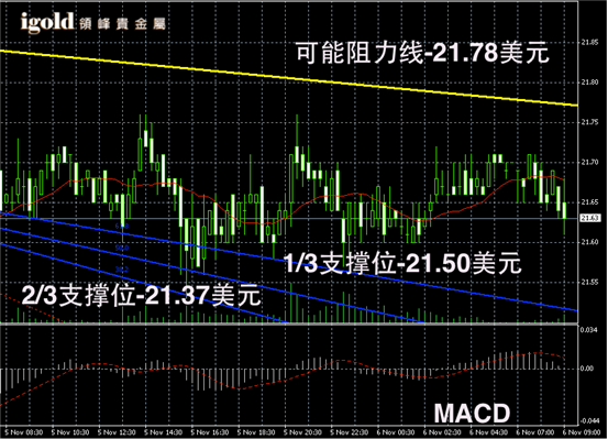 白银阴阳烛录得柱体较为平均,离散率不高,整体处于红色日平均移动线中位,短线MACD显示呈中性,后期白银价格或在21.5美元附近窄幅震荡。