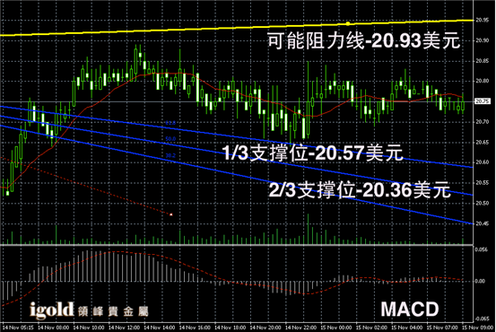 白银阴阳烛录得小幅持稳,后期阴阳烛间隔出现,柱体处于红色日平均移动线中位,短线MACD显示弱势多头主导,后期白银价格可能在20.8美元附近窄幅震荡。