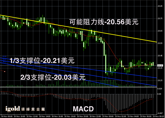 白银阴阳烛录得下行后,柱体小幅收短,显示整体有所持稳,但是后期阴烛仍然较多,且低于红色日平均移动线,短线MACD显示弱势空头主导,后期白银价格或继续小幅偏空下行。
