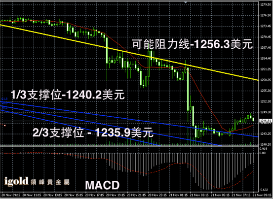 黄金价格长线阴阳烛目前大幅低于红色日平均移动线,且跌破了1250美元支撑下,长线MACD显示空头集聚,RSI则下行至29,由于RSI已经进入超卖区域,所以金价短线可能在1250美元附近小幅持稳震荡。