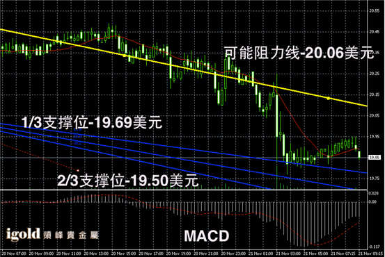 白银价格长线阴阳烛录得在跌破20美元支撑后,进入下一区间继续滑落,长线MACD显示空头集聚,RSI则录得24,已经进入超卖区域,未来白银价格可能在19.8美元附近窄幅震荡,并且有回升至20美元附近的趋势。