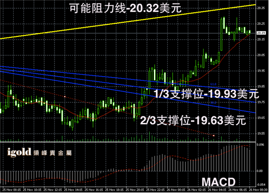 白银阴阳烛录得后期柱体高於红色日平均移动线,短线MACD显示多头反弹,柱体整体处於红色日平均移动线中位,后期白银价格或在20美元附近窄幅震荡。