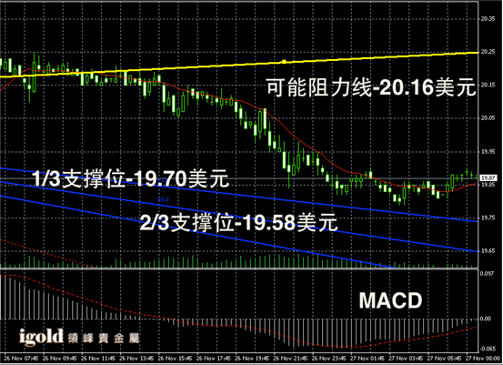 白银阴阳烛录得阴烛增多,且柱体处于红色日平均移动线中位,短线MACD显示弱势空头主导,白银价格短线可能围绕20美元上下偏空运行。