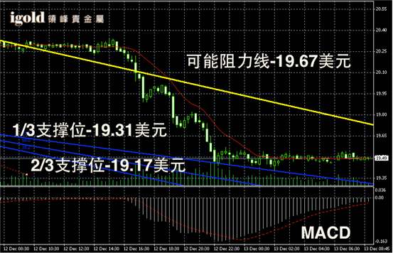白银短线阴阳烛录得阴烛增多,下行趋势明显,后期柱体收短,低位有所持稳,短线MACD显示弱势空头主导,白银价格短线或在19.5美元上行窄幅震荡。