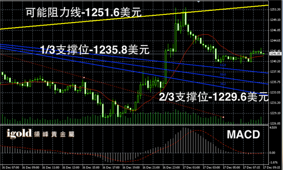 黄金阴阳烛录得反弹后,后期回落,柱体录得阴烛开始增多,短线MACD显示多头回落,后期黄金价格或在1230 – 1240 美元区间窄幅震荡。