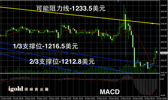 黄金阴阳烛录得下行后,柱体收短,后期重新高于红色日平均移动线,短线MACD空头有所减弱,后期黄金价格或在1225美元附近进一步持稳,窄幅震荡。
