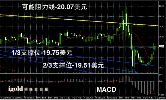 白银阴阳烛录得下行后,阳烛后期增多,且开始高于红色日平均移动线,短线U型反弹明显,同时MACD空头有所减弱,后期白银价格或在19.8美元上下窄幅震荡。