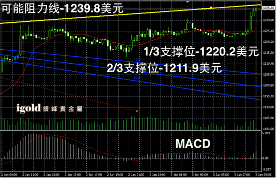 黄金阴阳烛录得柱体继续小幅高于红色日平均移动线,短线MACD显示多头正在集聚,后期阳烛录得增多,显示反弹势头继续,后期黄金价格或在1230 – 1240 美元区间偏多整理。