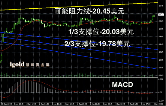 白银阴阳烛录得柱体较短,整体处于红色日平均移动线中位,短线MACD显示弱势多头主导,白银价格后期或在20美元附近窄幅震荡。