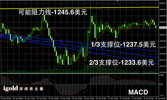 黄金阴阳烛录得后期柱体处于红色日平均移动线,短线MACD显示弱势多头主导,阴阳烛录得离散率较高,后期黄金价格或继续在1240美元附近震荡。
