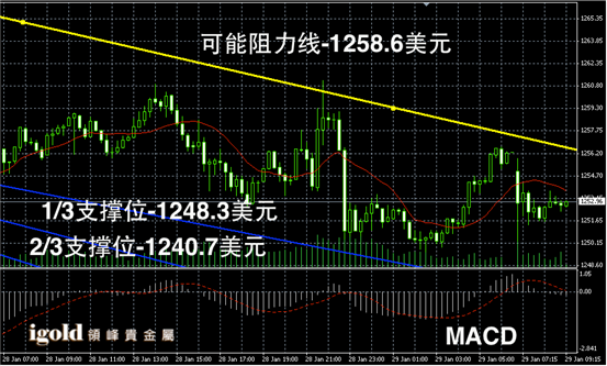 黄金阴阳烛录得后期柱体离散率加大,整体处于红色日平均移动线中位,短线MACD显示弱势空头主导,后期柱体开始持稳,整体黄金价格或在1250 – 1270美元区间内偏空整理。