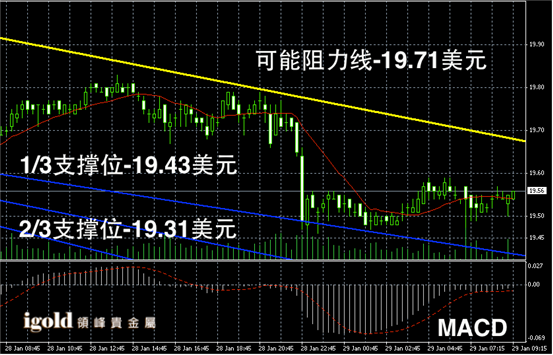 白银长线阴阳烛走势依旧不温不火,整体处于红色日平均移动线中位,长线MACD显示呈中性,RSI则上升至50附近,白银价格后期或继续在19.5 - 20美元线附近窄幅持稳。