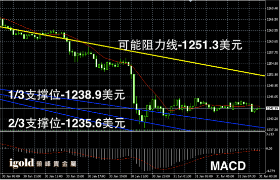短线黄金阴阳烛录得后期阴烛增多,且回落趋势明显,短线MACD显示弱势空头主导,后期黄金价格或在1240美元线附近偏空整理。