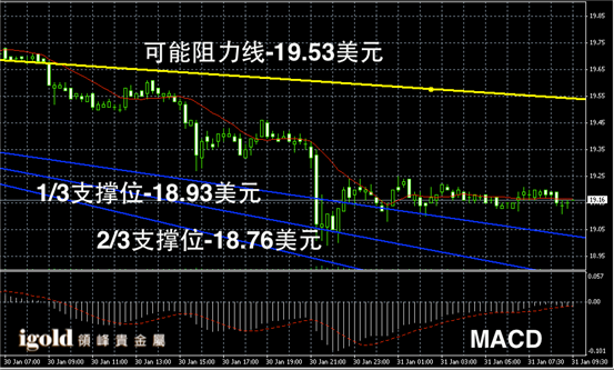 白银阴阳烛短线录得阴烛增多,且整体处于红色日平均移动线中位,短线MACD显示弱势空头主导,后期白银价格或在19 – 19.5美元区间偏空整理。