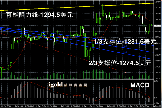黄金阴阳烛录得中期有V型反弹,后期柱体小幅回落,但是整体阳烛依然较多,且短线MACD显示多头回落,黄金价格短线或在1280 – 1290 美元区间偏空整理。