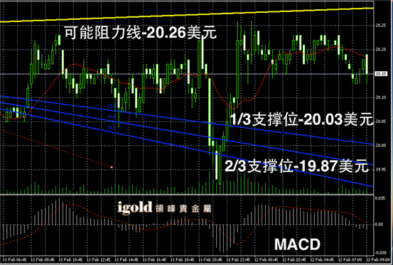 白银阴阳烛录得上行后,柱体回落,整体处于红色日平均移动线中位,短线MACD显示弱势空头集聚,后期白银价格或向20美元附近偏空回落,若持稳20.2美元,则可能继续反弹。