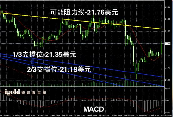 白银阴阳烛录得下跌后,出现了“底部背离”,显示持稳趋势,加上末端阳烛增多,短线MACD显示空头减少,短线白银价格或在21.5美元附近窄幅整理。