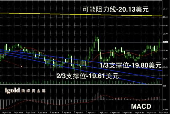 白银阴阳烛录得调整后,整体处于红色日平均移动线中位,短线MACD显示呈中性,柱体聚焦明显,白银价格或继续在19.9美元上下盘整。