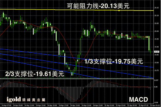 白银阴阳烛录得反弹后回落趋势明显,阴烛录得增多,且开始低于红色日平均移动线,短线MACD显示弱势空头主导,后期白银价格或继续小幅下行。