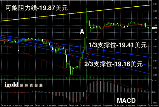 白银阴阳烛录得V型反弹明显,柱体后期整体处于红色日平均移动线中位,短线MACD显示呈中性,后期白银价格或整体在19.5美元附近不断持稳。