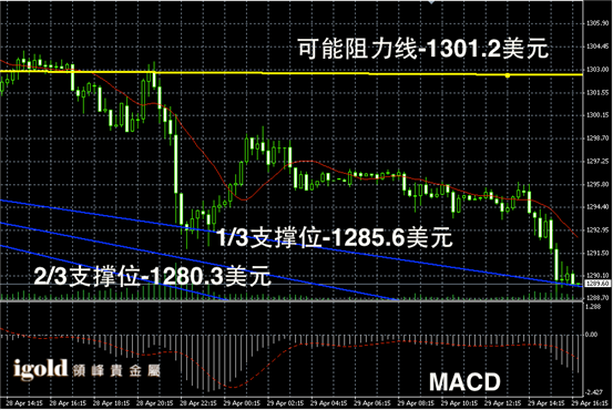 黄金阴阳烛录得阴烛增多,后期柱体低于红色日平均移动线,短线MACD显示弱势空头主导,黄金价格或继续偏空下行。短线或小幅下探至1280美元附近震荡。