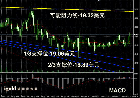 黄金阴阳烛录得柱体较短,整体处于红色日平均移动线中位,短线MACD显示呈中性,后期金价或继续偏空整理,尤其关注1290美元线能否持稳,若跌破则可能继续下行。