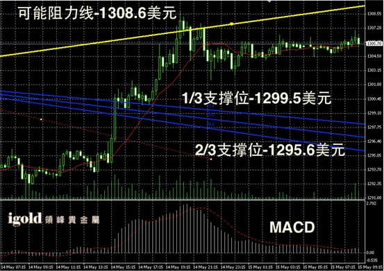 黄金阴阳烛录得反弹后,柱体收短,整体处于红色日平均移动线中位,短线MACD呈中性,后期金价或继续在1305美元附近整理,后期或仍有小幅的反弹动力。