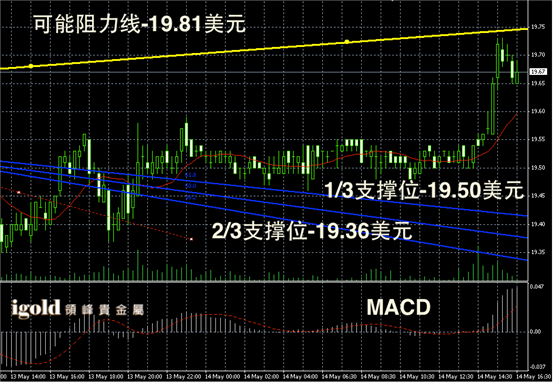 白银阴阳烛录得出现了小幅攀升的迹象,后期阳烛增多,且高于红色日平均移动线,短线MACD显示弱势多头主导,白银价格或仍有小幅攀升空间,不过19.8美元附近的阻力较大。