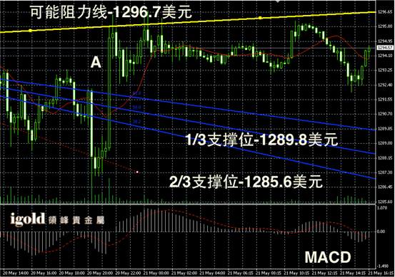 黄金阴阳烛录得离散率加大,柱体录得高低交叉于红色日平均移动线,短线MACD显示呈中性,后期黄金价格或继续在1290美元线附近偏空整理,低位支撑可参考阳烛A的最低价。