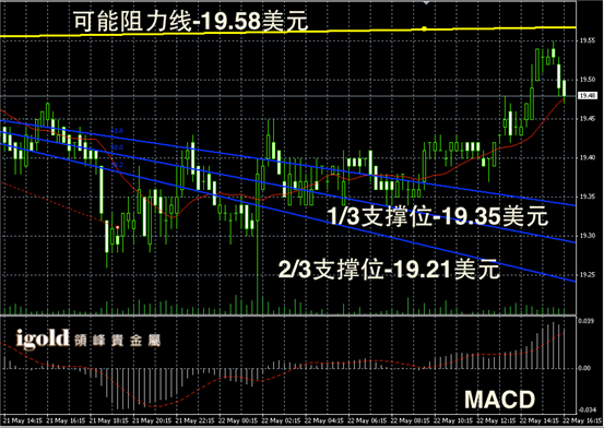 白银阴阳烛录得出现了小幅的U型反弹,后期录得阳烛增多,末端录得柱体小幅高于红色日平均移动线中位,短线MACD显示弱势多头主导,白银价格短线或在19.5美元附近持稳。