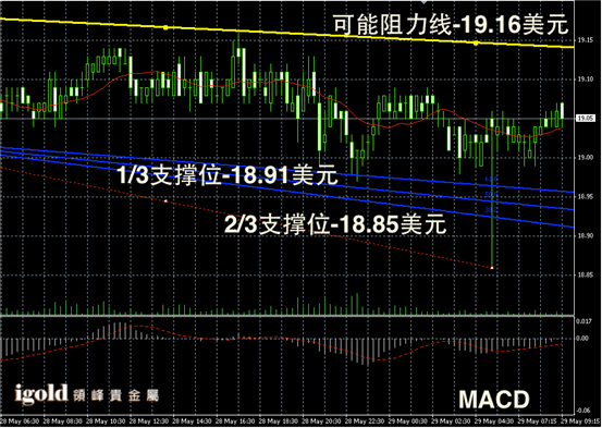 白银阴阳烛录得基本收平,整体阴阳柱间隔出现,且高低交叉于红色日平均移动线中位,短线MACD显示呈中性,后期白银价格或录得在19美元线附近窄幅波动。