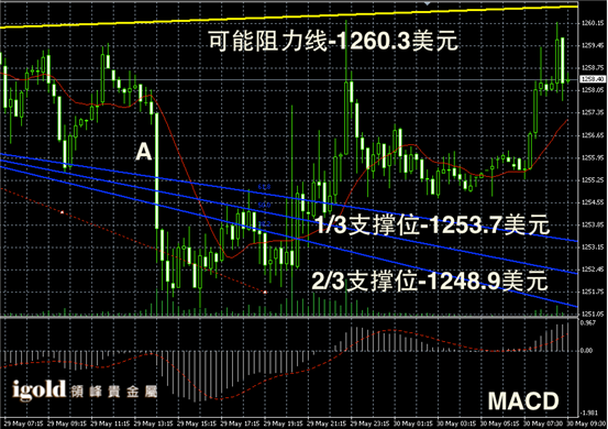 黄金阴阳烛录得出现了明显的U型反弹,主要是受到美国GDP下行的带动,后期阳烛录得增多,且高于红色日平均移动线,短线MACD显示弱势多头主导,金价短线或在1250–1260美元区间持稳。若突破1260美元,则继续反弹,否则或回落,且可参考阴烛A的高低价作为整理区间。