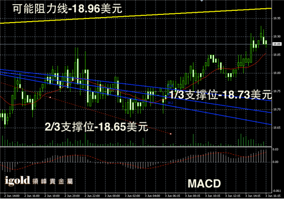 白银阴阳烛短线录得出现反弹趋势,阳烛增多,且小幅高于红色日平均移动线,短线MACD显示弱势多头主导,后期白银价格或继续小幅反弹,整体或冲击19美元线附近。