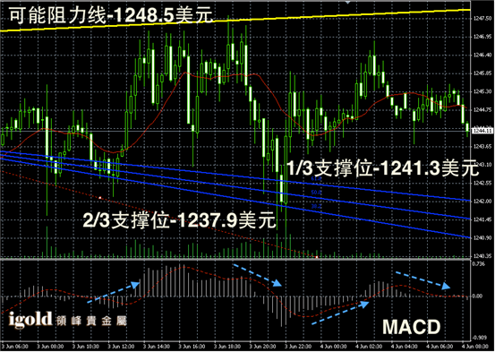 黄金长线阴阳烛末端录得出现了吊颈线,有持稳现象发生,不过长线MACD空头还在增加,整个金价长线在Fibonacci区间的下行趋势没有衰减迹象。长线RSI录得39,短暂持稳,但仍在下行轨道。未来持稳关键点将落在1240美元线上,一旦跌破则可能向1227美元线附近的低位滑落。如果晚上8点以后,金价仍能持稳1245美元线以上,那么后期或出现小幅反弹。