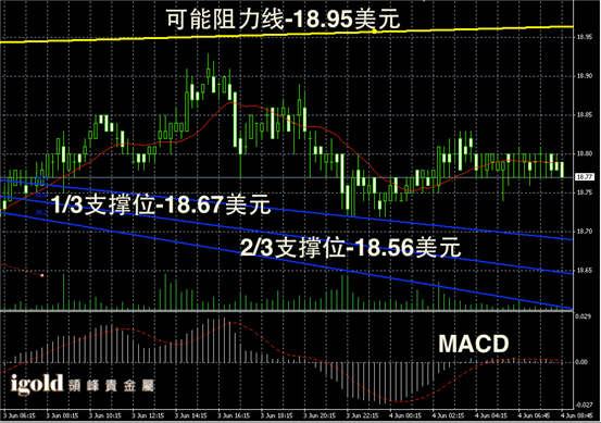 白银阴阳烛录得反弹失败,后期阴烛增多,且平均分布在红色日平均移动线中位,短线MACD显示呈中性,白银价格短线或在18.8美元附近偏空整理。