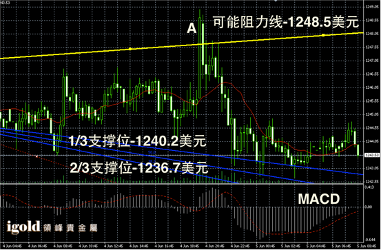 技术回顾:昨晚的评论中,我们反复论述了“金价或继续在1245美元线附近持稳”,从晚上至今天凌晨的走势再次印证了我们的研判。且金价在高位阻力线上,我们也给出了准确的预测值。