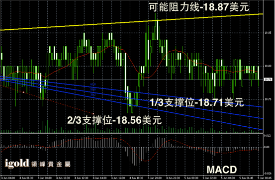 白银阴阳烛录得离散率高,且主体分散非常明显,高低交叉于红色日平均移动线,短线MACD显示多空轮番主导,白银价格短线或继续在18.8美元线附近持稳。