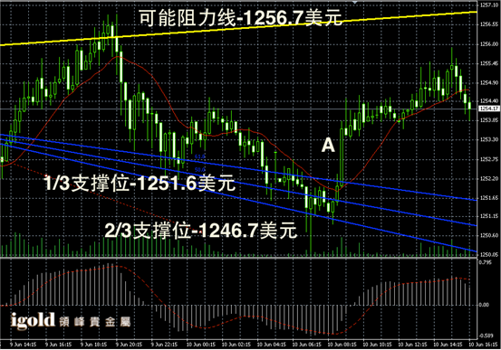 黄金阴阳烛录得出现了明显的V型反弹,后期阳烛增多,且高于红色日平均移动线中位,短线MACD显示多头主导,金价未来或在1250–1256美元区间整理,整体仍有小幅反弹空间,低位支撑可首先参考阳烛A的最高价。