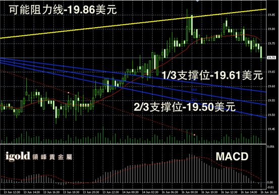 白银阴阳烛录得离散率加大,反弹后高低交叉于红色日平均移动线中位,短线MACD显示多头转空,白银价格或小幅回调至19.6美元线附近,多空分界建议参考19.7美元线。