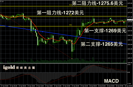 黄金长线阴阳烛录得继续向红色日平均移动线附近靠拢,但是未能突破,末端有所回落,长线MACD呈中性,RSI则录得收平在45,有小幅下行,此次金价的反弹已经结束,尤其是周四美联储FOMC会议前,市场再次反弹的几率不大,因为下跌后,首先是区间调整,上午金价或在1270美元附近窄幅修正,以1269–1275美元为多空参考区间,突破上限则继续反弹,跌破下限则回落。