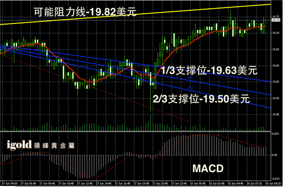 白银阴阳烛录得反弹后,柱体收短,整体处于红色日平均移动线中位,短线MACD显示弱势空头主导,后期白银价格或在19.75美元附近整理,震荡区间可参考19.6-19.8美元区间。